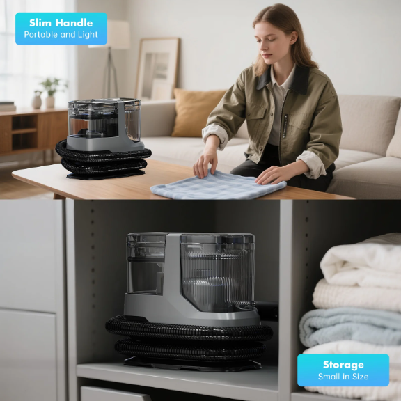 “لو سجادك أو كنبتك أو سيارة أطفالك اتبهدلت — الحل معاك في جهاز صغير ينقل النظافة لأي مكان”